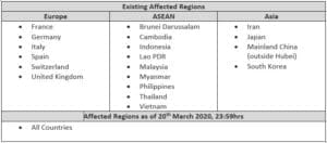 With effect from 20th March 2020, 23:59hrs, affected regions will be further expanded to include all countries.